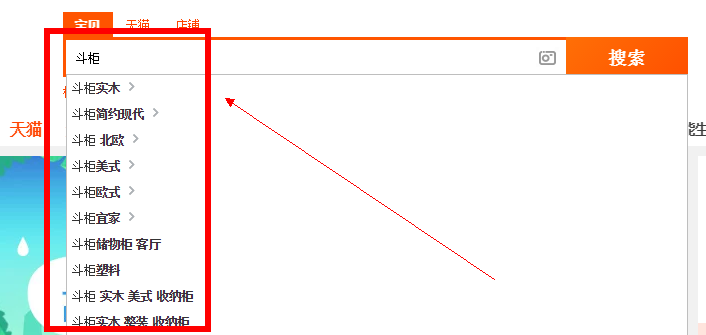 还有第二个免费的选词方法,第一步直接在搜索框搜斗柜,淘宝下拉框会有这个词的相关搜索词,只要是下拉框推荐的就是有人搜索过有数据的词,寻找二级词,首先推荐的是斗柜实木这个二级词,我们就先来搜索斗柜实木。